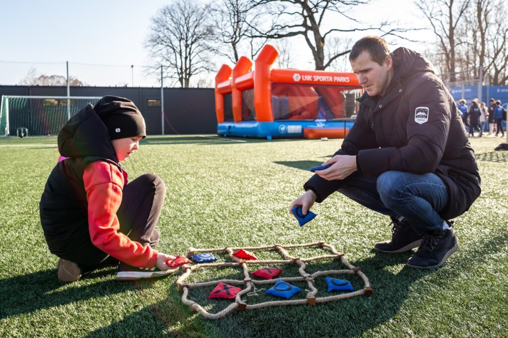 Apmeklētājiem piedāvājam: talismanu – Remi, seju apgleznošanu, lielos burbuļus, piepūšamo atrakciju, lielformāta – jengu, 4rindā, cornhole, domino, cirku, dambreti un daudz citas interesantas spēles – absolūti viss piedāvājums bez maksas, no FC RFS un Laiks Jauniešiem puses iespējams iegūt dažādas dāvaniņas.