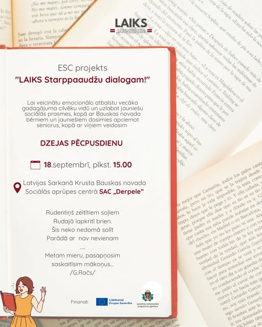 Aicinām tevi 18.septembrī, plkst. 15.00 pievienoties mums un doties uz Sociālās aprūpes centru SAC “Derpele”, lai mēs kopīgi ar Bauskas novada bērniem un jauniešiem dotos apciemot seniorus un veidotu Dzejas pēcpusdienu.