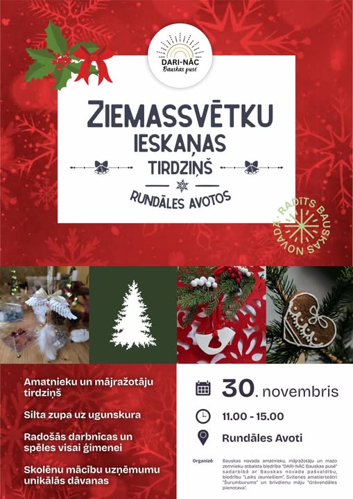 Apmeklētājus priecēs Ziemassvētku tirdziņš, kur varēs baudīt sirsnīgu atmosfēru, iegādāties vietējo mājražotāju, amatnieku un arī skolēnu mācību uzņēmumu darinājumus, piedalīties radošās darbnīcās un nogaršot gardu zupu, vārītu uz ugunskura.
