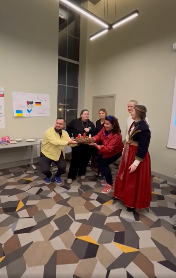 Nebraucām ar tukšām rokām un dāvājām mūsu brāļiem – draugiem jauniešu radīto Adventes vainagu no sarkanajām ozo0lzīlēm! Vladas un Aiste ir fantastiski apmācību vadītāji – ļoti novērtējam iespēju no tiem mācīties un strādāt kopīgos projektos.