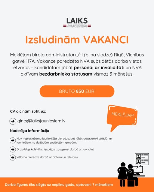 Vakance paredzēta NVA subsidētās darba vietas ietvaros – kandidātam jābūt personai ar invaliditāti un ar NVA aktīvu bezdarbnieka statusu vismaz 3 mēnešus.