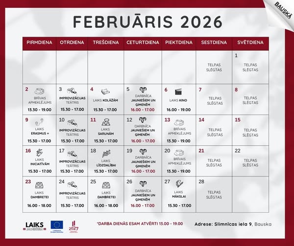 Februārī Bauskas nodaļā (Slimnīcas iela 9) gaidāmas dažādas interesantas aktivitātes – radošas darbošanās, spēļu vakari, sarunas, izaicinājumi un citas foršas tikšanās kopā.