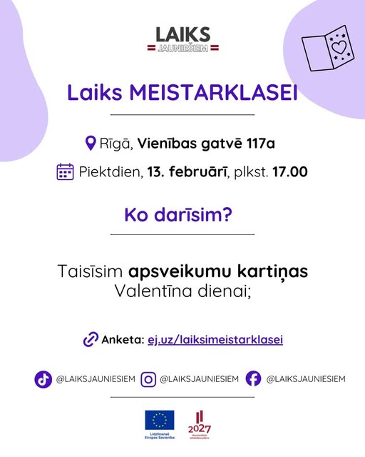 Meistarklases laikā kopā veidosim apsveikuma kartiņas Valentīna dienai un stiprināsim kopā būšanas sajūtu. Ja vēlies iesaistīties, attīstīt savas idejas un būt daļa no aktīvas jauniešu kopienas, noteikti piesakies.