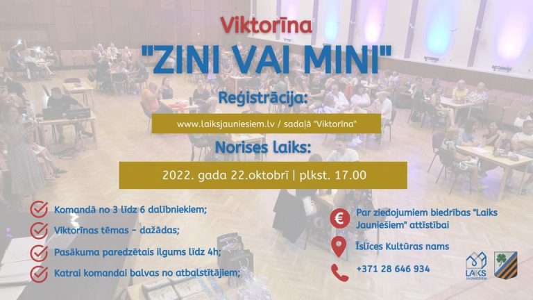 Biedrība “Laiks Jauniešiem” 2022. gada 22. oktobrī, plkst. 17.00, Īslīces kultūras namā, sadarbībā ar Īslīces pagasta nodaļu organizēs viktorīnu “Zini vai mini”. Katra viktorīnas kārta tiks organizēta savā tēmā. Plānots, ka pasākuma ilgums būs līdz četrām stundām. Viktorīnā aicinām piedalīties…